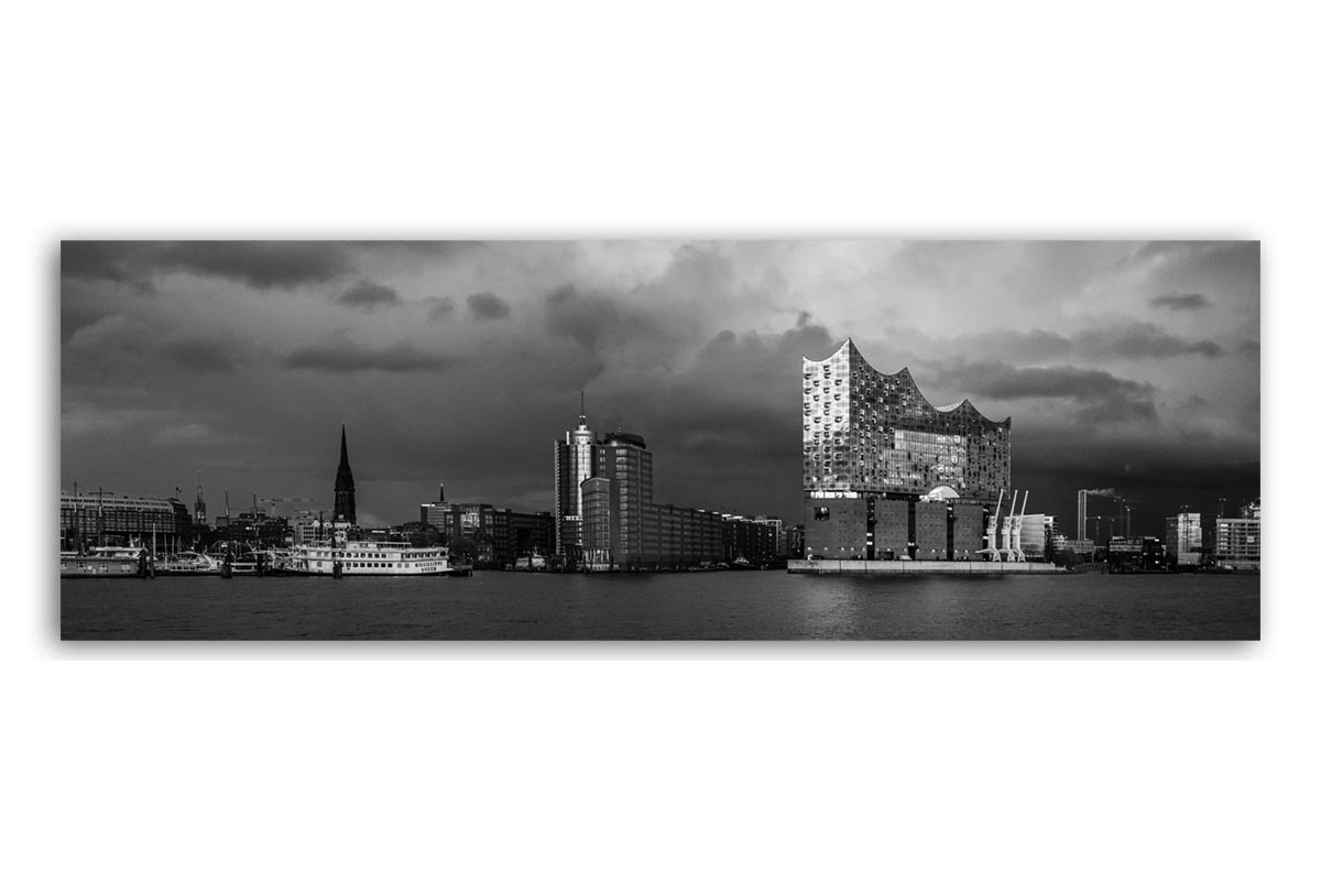 Panoramabild der Elbe mit Blick auf Kehrwiederspitze und Elbphilharmonie als Wandbild