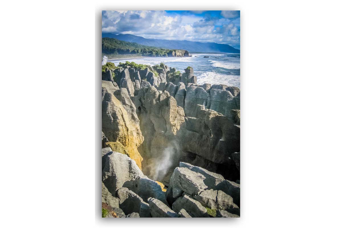 Die Pancake Rocks in auf der Südinsel Neuseelands sind ein tolles Naturschauspiel. Durch die sogenannten „Blow Holes“ schießt immer wieder Wasser hoch. Der Grund dafür ist, dass Wellen in eine Art Höhle schießen und das Wasser wiederum schießt über einen Ausgang nach oben. Echt Wahnsinn.
