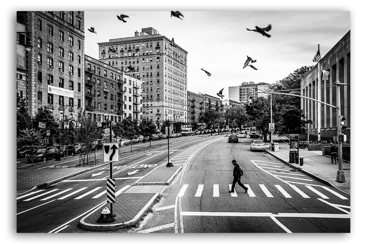 Mein persönlicher Favorit der New York-Fotos. Ein Mann, der die Straßen von Brooklyn überquert. Die Straßen sehen wie leer gefegt aus, lediglich ein paar Tauben fliegen davon – eine ganz normale Alltagssituation. Aber dennoch erzählt dieses Foto eine Geschickte.